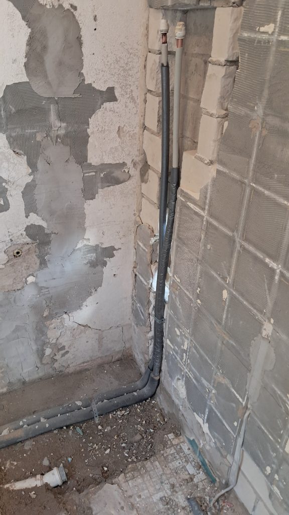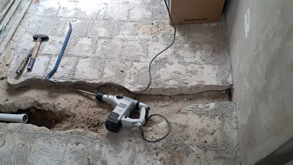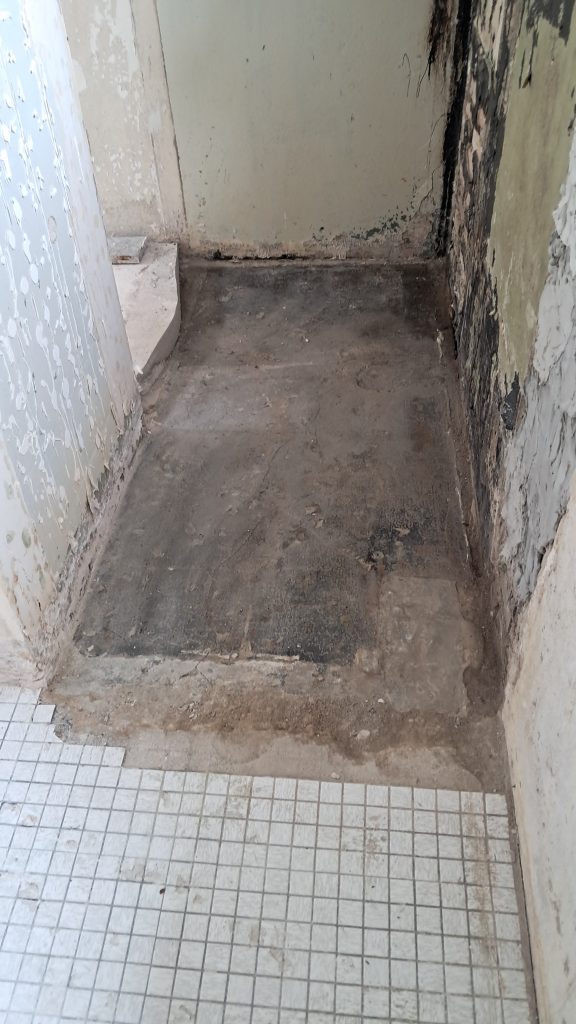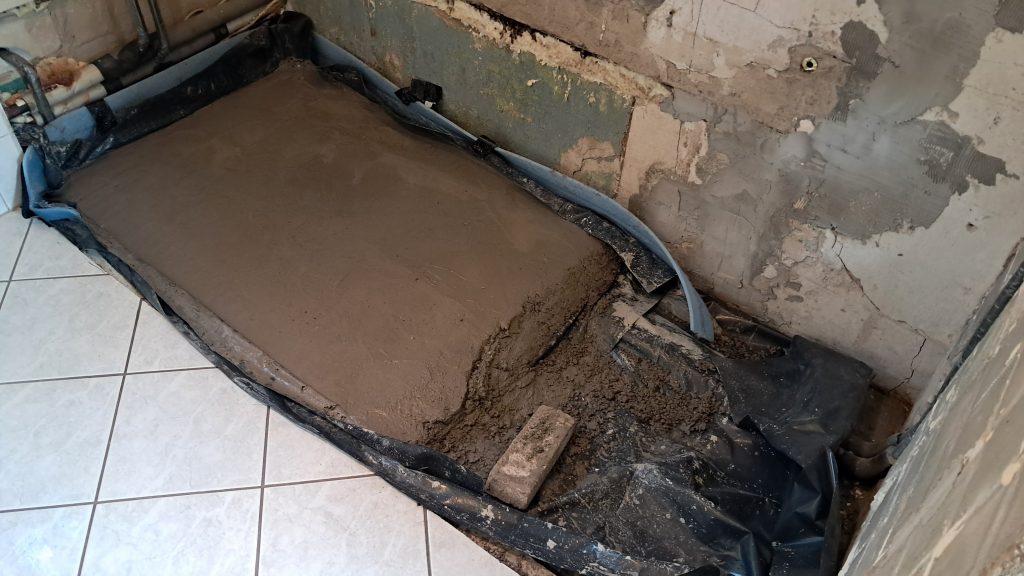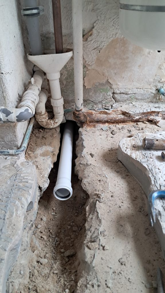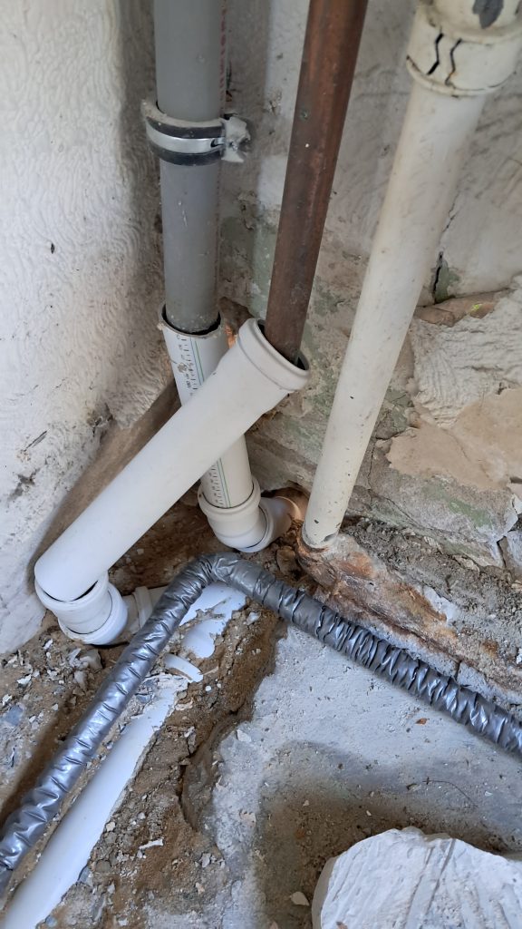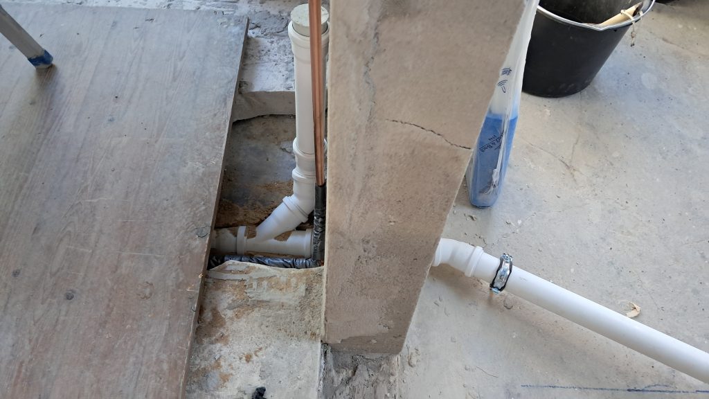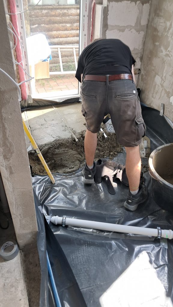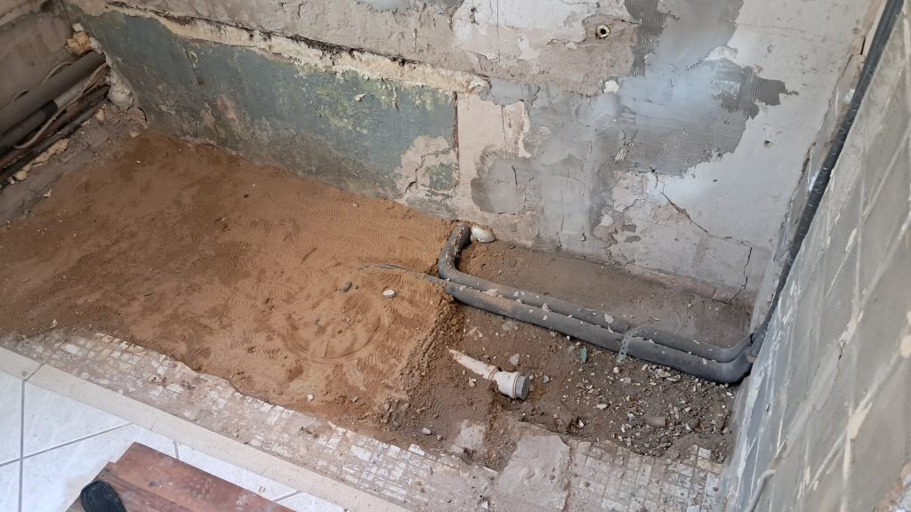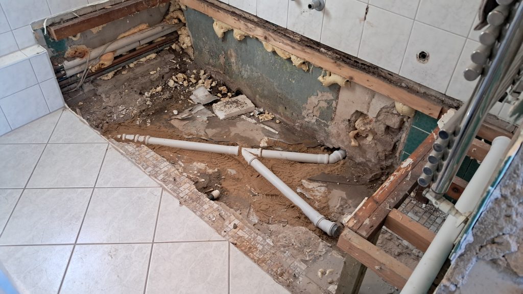 Die alte Badewanne ist raus. Neue Abflussrohre für die zukünftige Dusche sind montiert