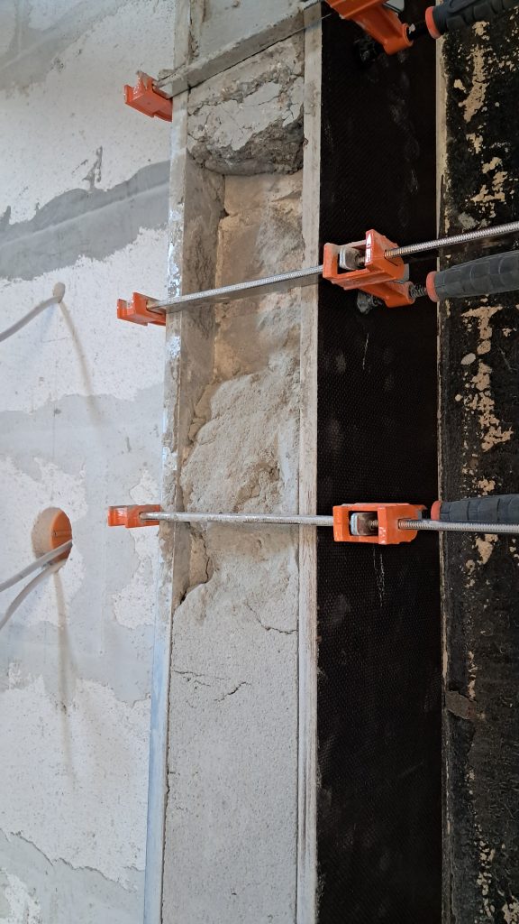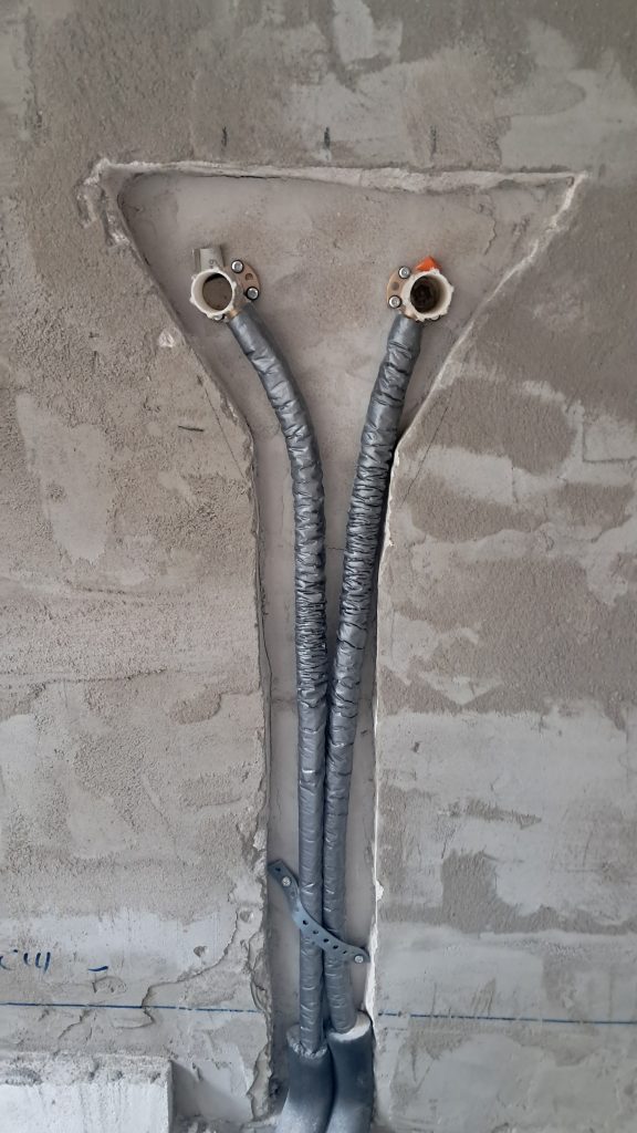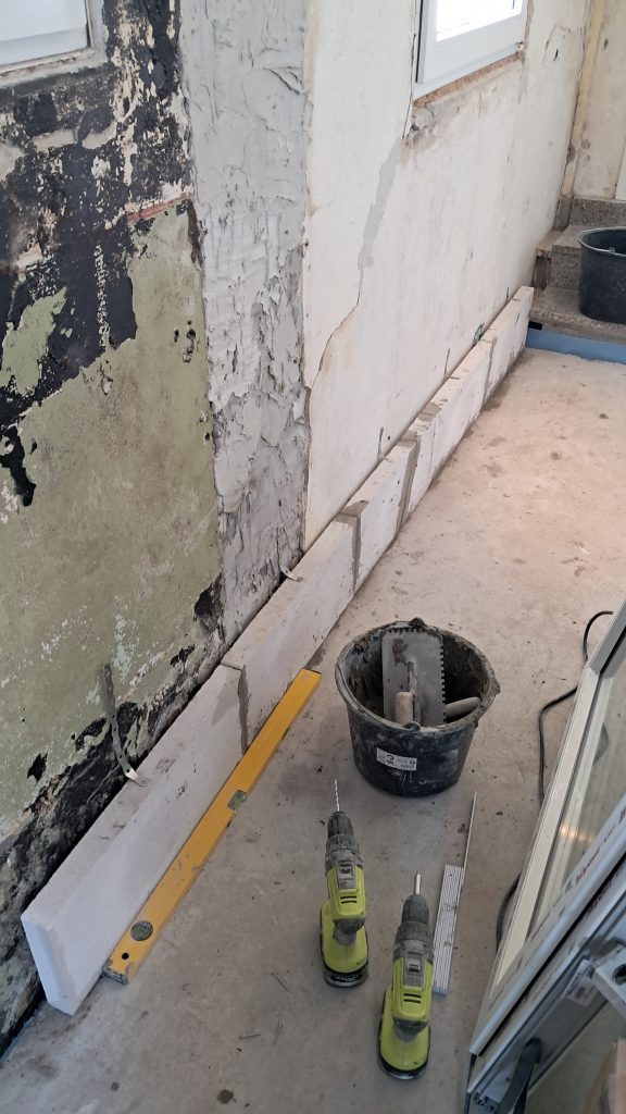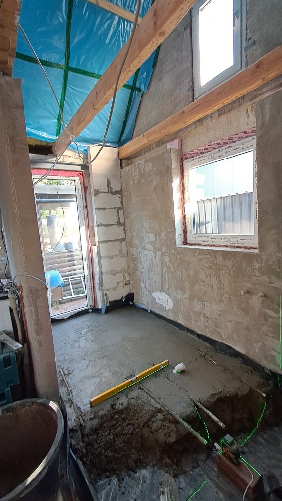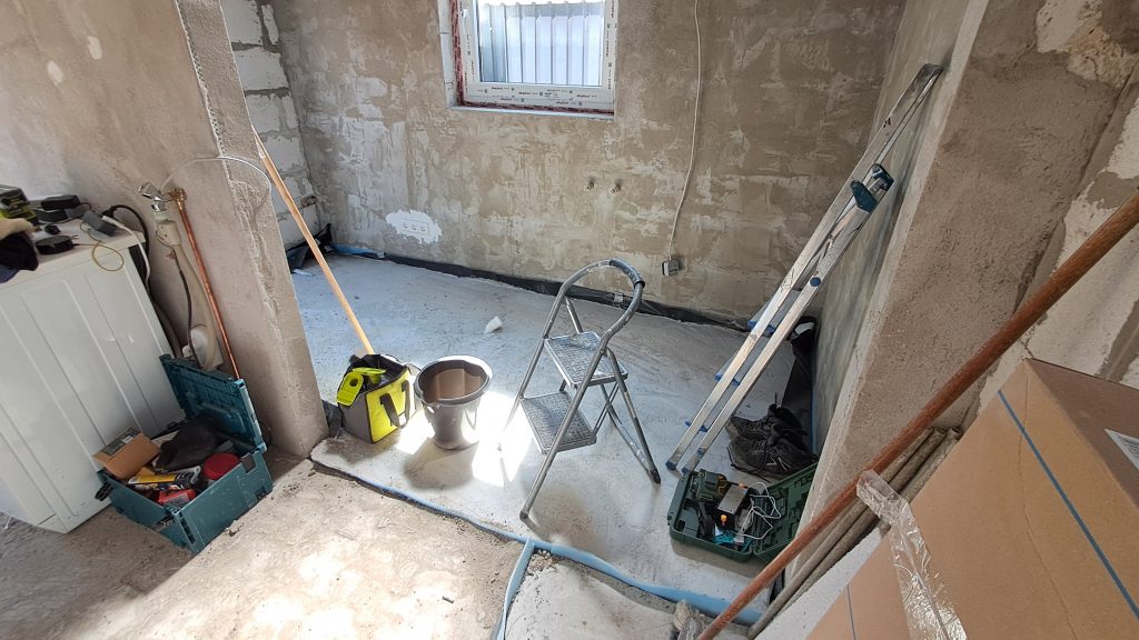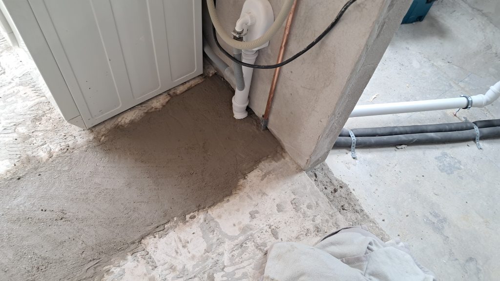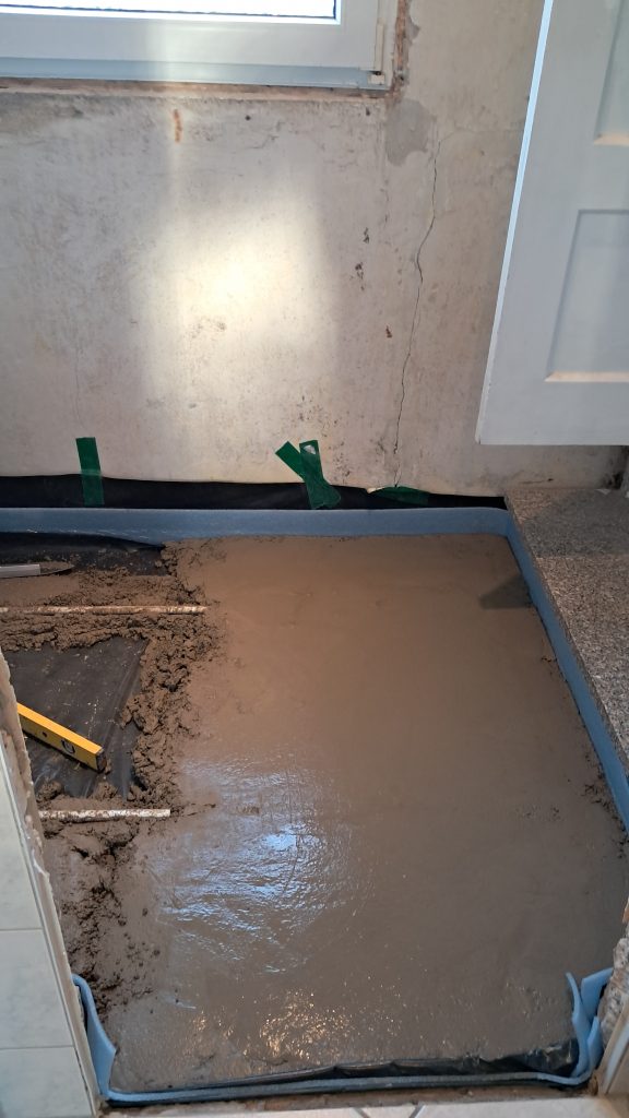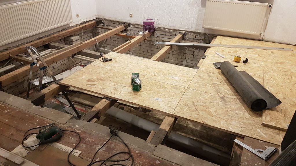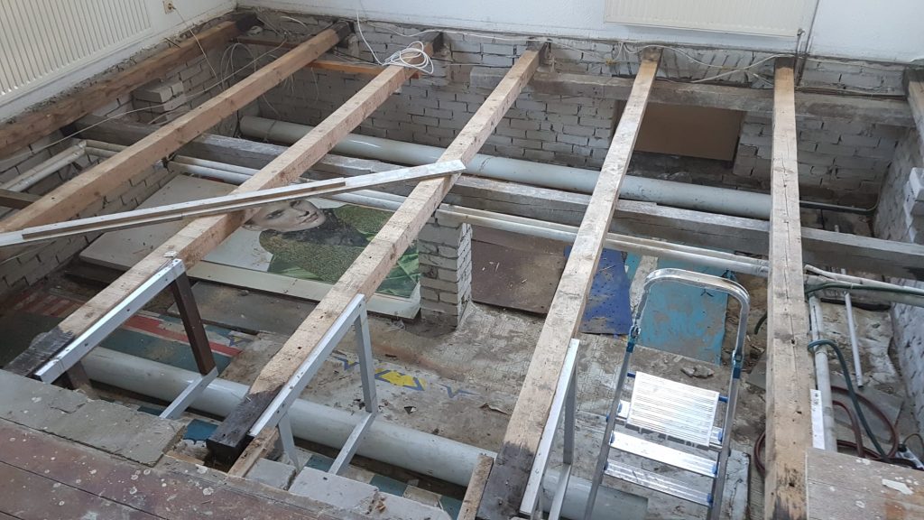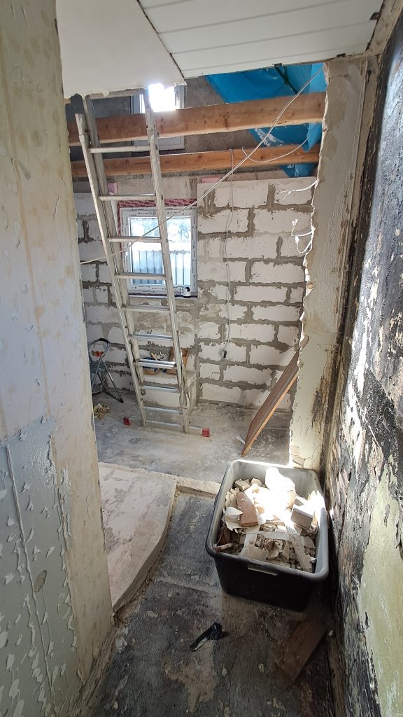 Die alte Badewanne ist raus. Neue Abflussrohre für die zukünftige Dusche sind montiert