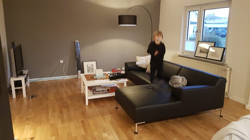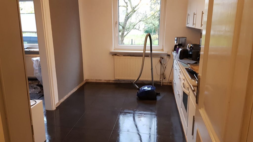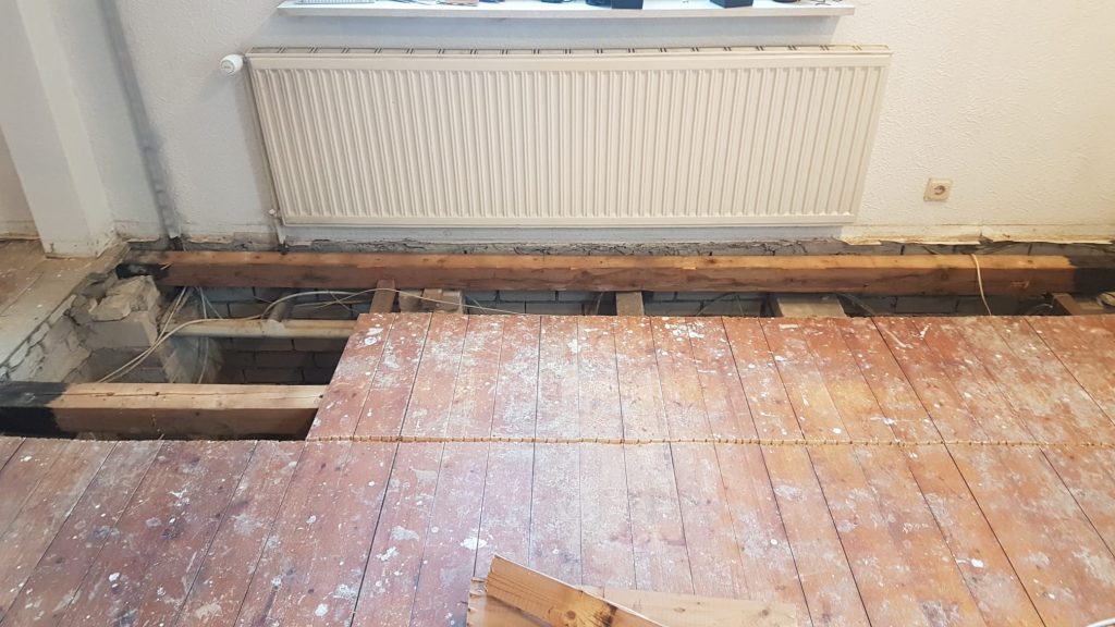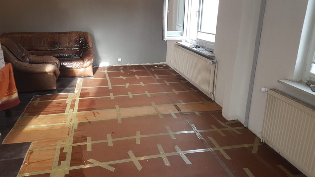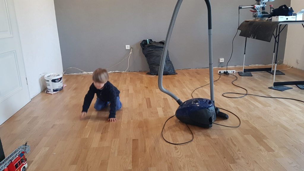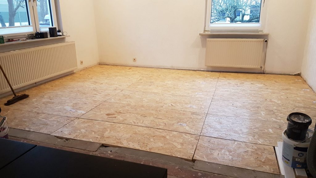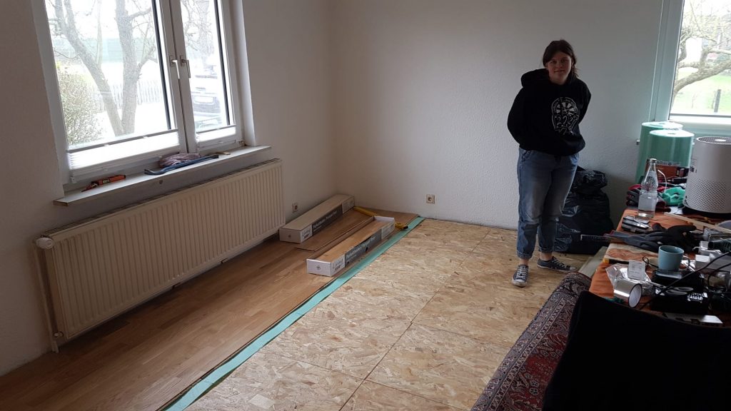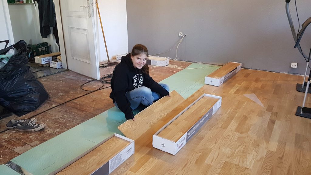 Der Wohnzimmerboden musste raus. Alles war krumm und schiefNeuer Parkettboden. Wer hat’s verlegt? Anna.Anna beim Parkett verlegen. Linus denk sich was dabei.Geschafft. Der Boden ist drin. Es fehlen noch die Fußleisten.